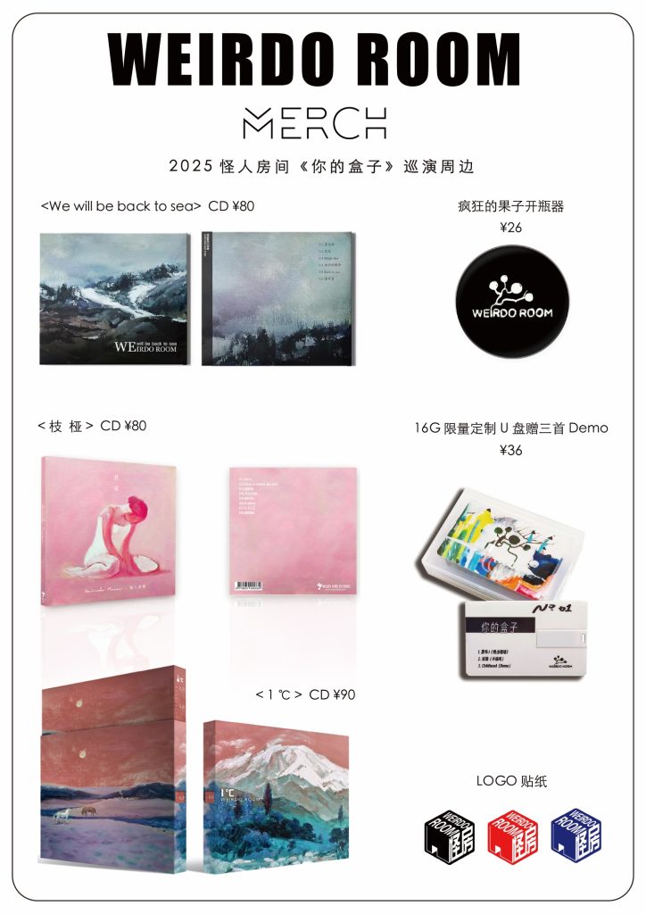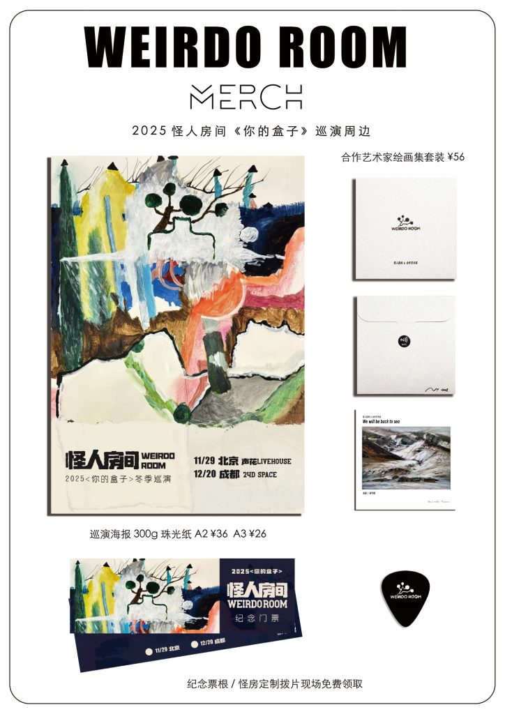 1°C,枝桠,We will be back to sea,疯狂的果子磁吸徽章&开瓶器(2025冬季巡演限定版本),怪房&合作艺术家绘画作品集套装(限量版),《你的盒子》U盘(赠送3首Demo),怪房定制拨片(现场领取),贴纸(现场领取),定制票根(现场领取)。